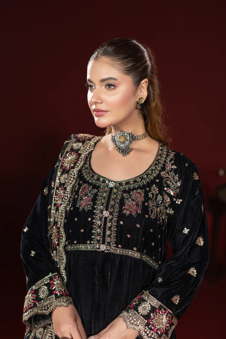 Step into regal elegance with our Black Velvet Kalidar. Meticulously crafted for the modern woman who cherishes tradition, this ensemble is the perfect choice for winter Eid, weddings, formal dinners, and festive galas.