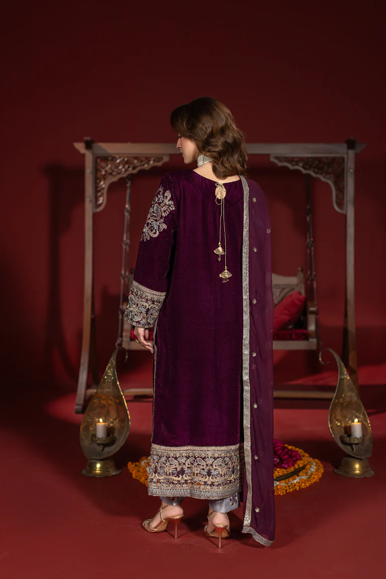 3Pc Embroidered Plum Purple Velvet Kaftan Set