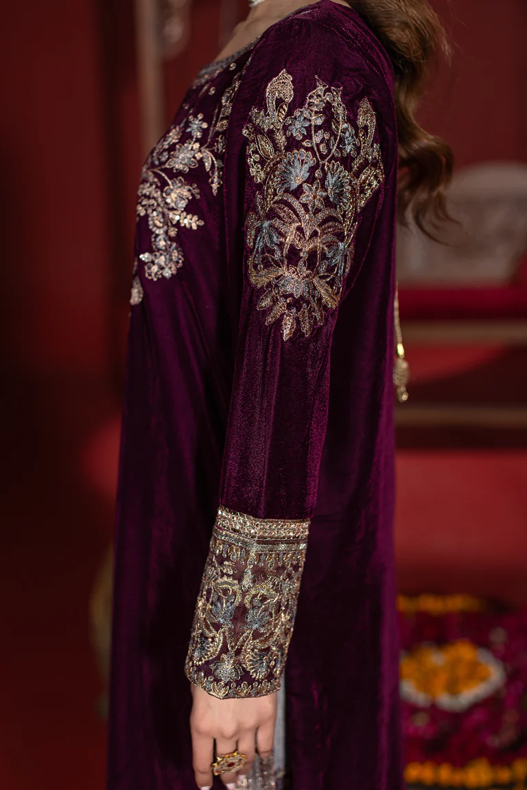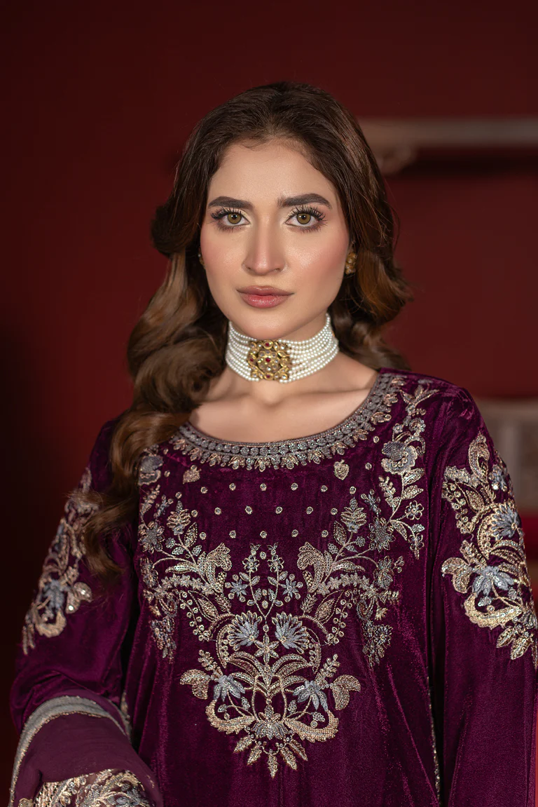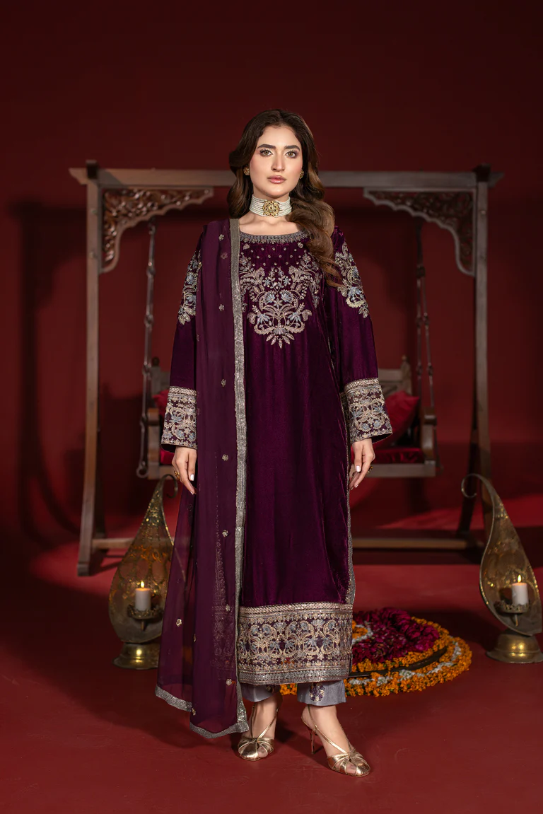 Elevate your festive wardrobe with this luxurious 3-piece velvet kaftan set, designed to exude timeless grace and sophistication. Crafted from premium-quality velvet, the kaftan features intricate floral embroidery across the front, sleeves, and hemline, adding a rich and regal touch to the deep, elegant hue.