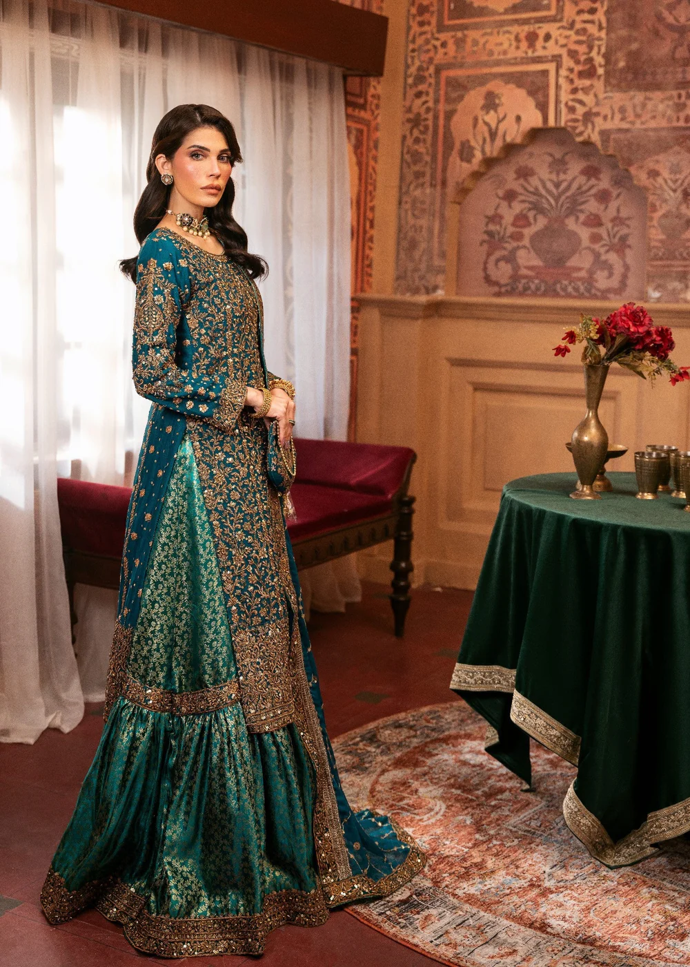 Elegant 4-piece teal Lehenga ensemble featuring a chiffon embroidered top, flared jamawar lehenga, chiffon dupatta, and matching potli.